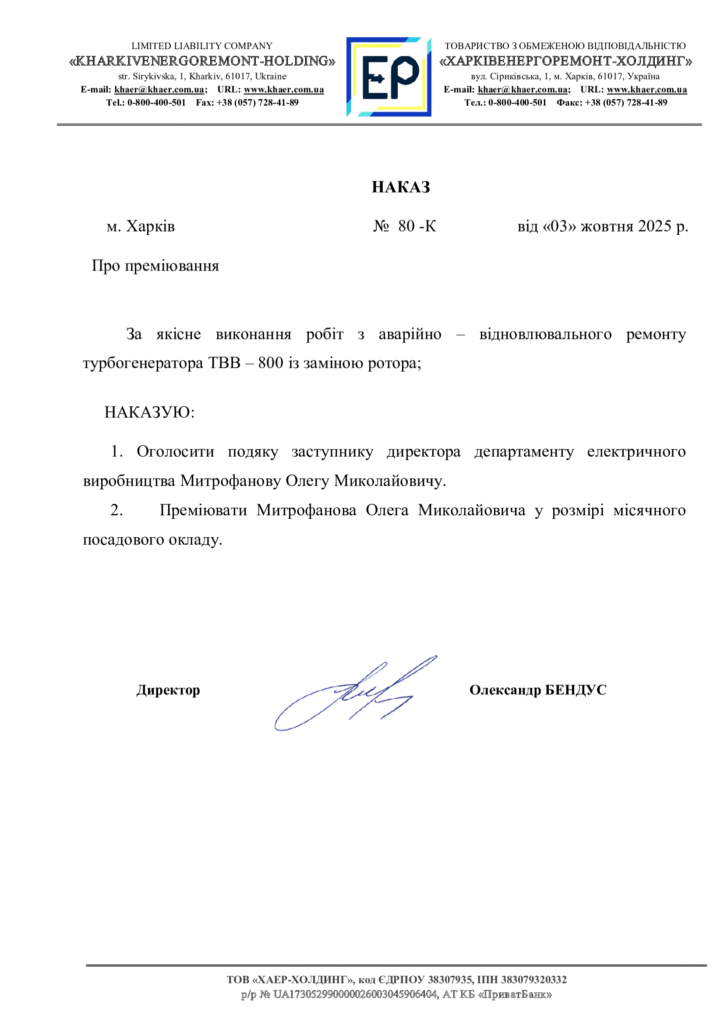 За якісне виконання робіт з аварійно-відновлювального ремонту турбогенератора 04.10.2025 ДомашняЖиття колективуЗа якісне виконання робіт з аварійно-відновлювального ремонту турбогенератора